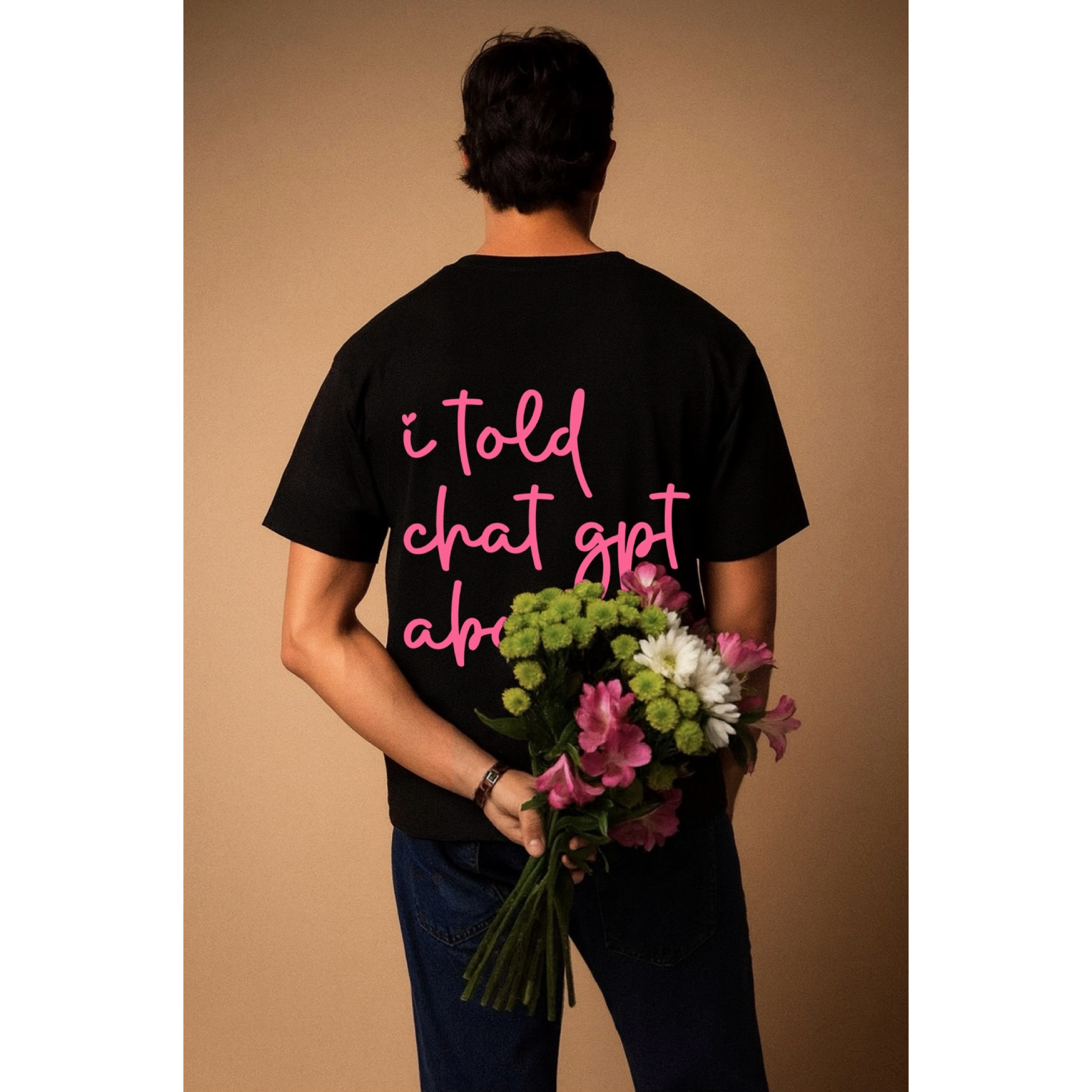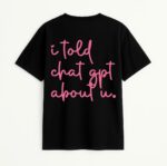 Cut from luxe cotton fabric, this piece blends aesthetic minimalism with a trending twist. The bold script “i told chat gpt about u” graphic feels warm and personal — the kind of tee that makes people smile twice.